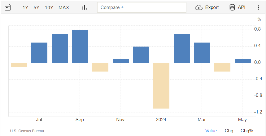 Le vendite al dettaglio a maggio a livello mensile crescono dello 0,1%, dopo un -0,2% registrato ad aprile (rivisto da +0,0%). Il dato è rilasciato dall’U.S. Census Bureau.