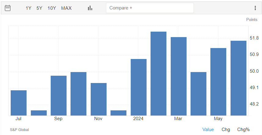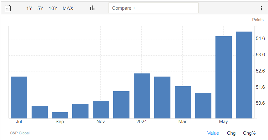 Per quanto riguarda il PMI relativo al settore dei servizi, il dato preliminare di giugno è di 55,1 punti, sopra alla rilevazione di maggio di 54,8 punti.