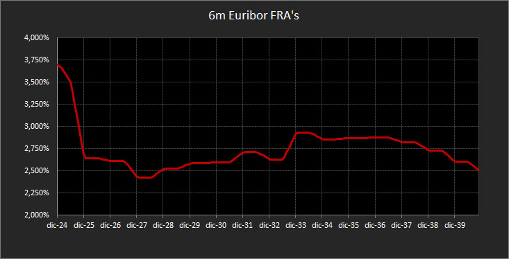 Stabili le previsioni fornite dai tassi forward su Euribor 6 mesi sulle scadenze a breve, con tassi attesi poco sotto area 3,75% per inizio 2025. Si conferma anche la discesa pronunciata sempre sulla parte a breve, con la curva che scende repentinamente per assestarsi nell’intervallo di area 2,60% - 2,50% per le scadenze 2028-2031. Confermata in avanti la previsione di risalita dei tassi, sempre a partire da metà 2033, con un picco verso area 3,00% al 2034 per stabilizzarsi poi sopra area 2,75% sulle scadenze sino al 2038.