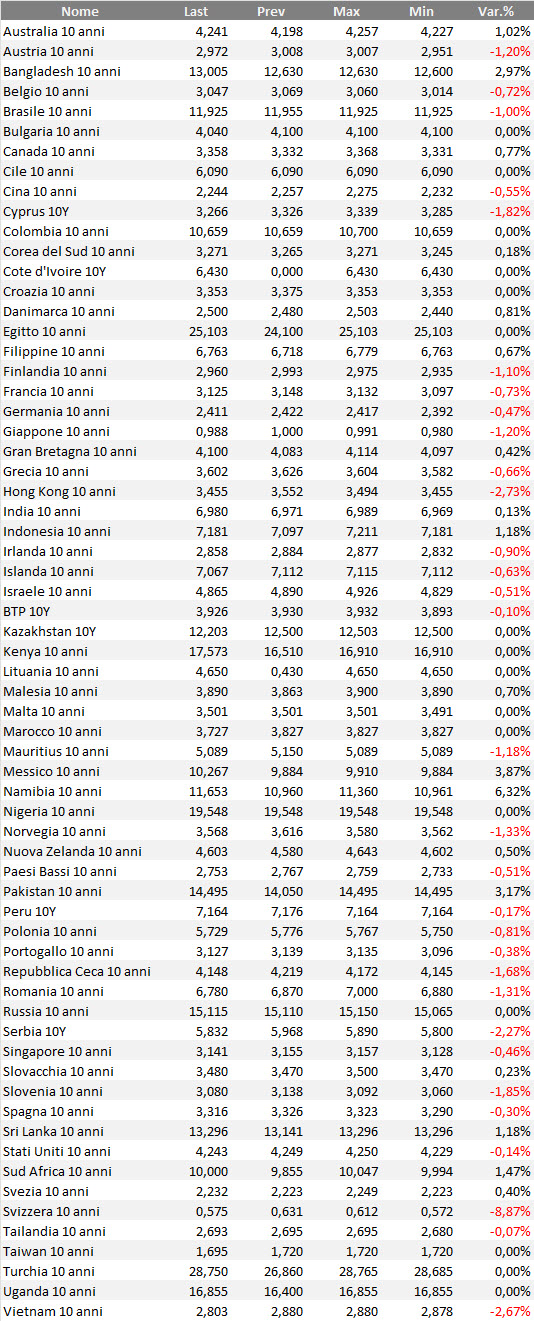 Tabella dei rendimenti, su base settimanale, delle obbligazioni governative mondiali con qualunque rating.