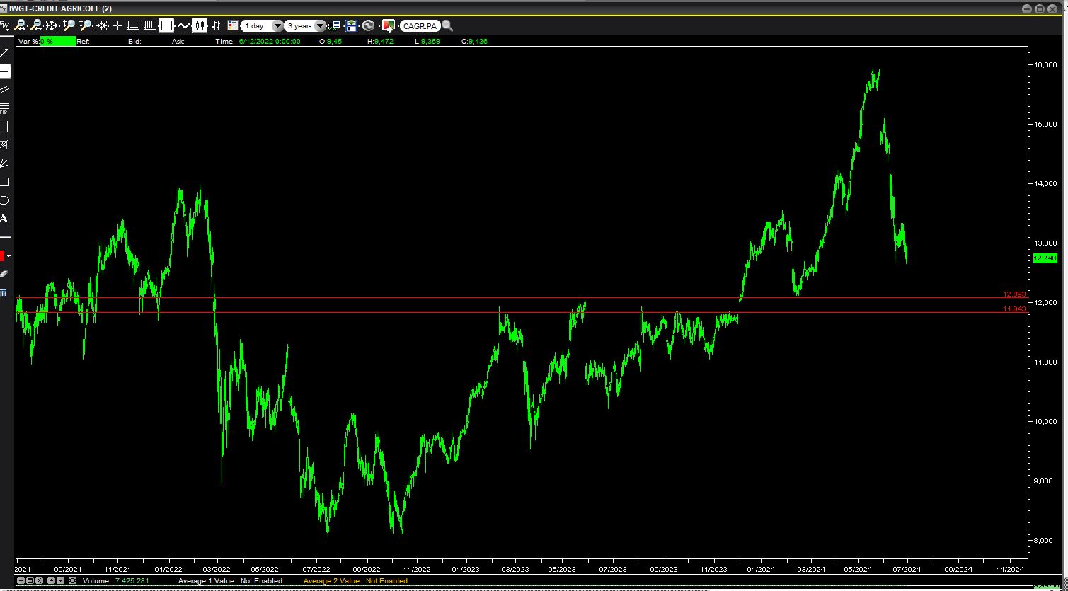 Credit Agricole, altro giro, altra corsa. Due gap down e possibile base attorno a 12.15 rispetto ai 12.74 di chiusura di venerdì.
