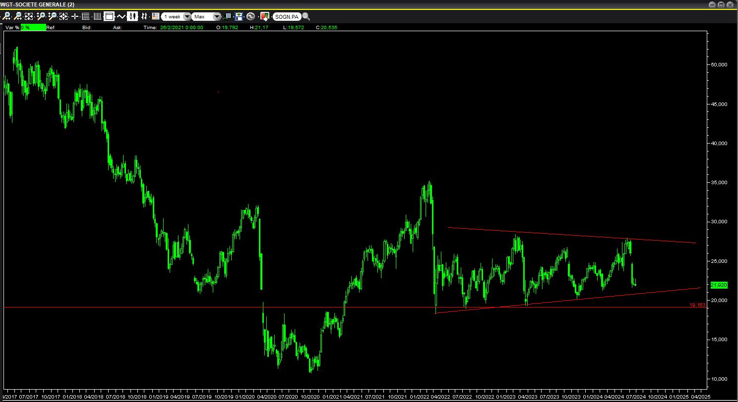 Societé Generale su scala settimanale è inserita in un lungo laterale con massimi decrescenti e minimi crescenti. Non mi stupirebbe un ulteriore affondo verso 20 euro prima e 19,20 poi.