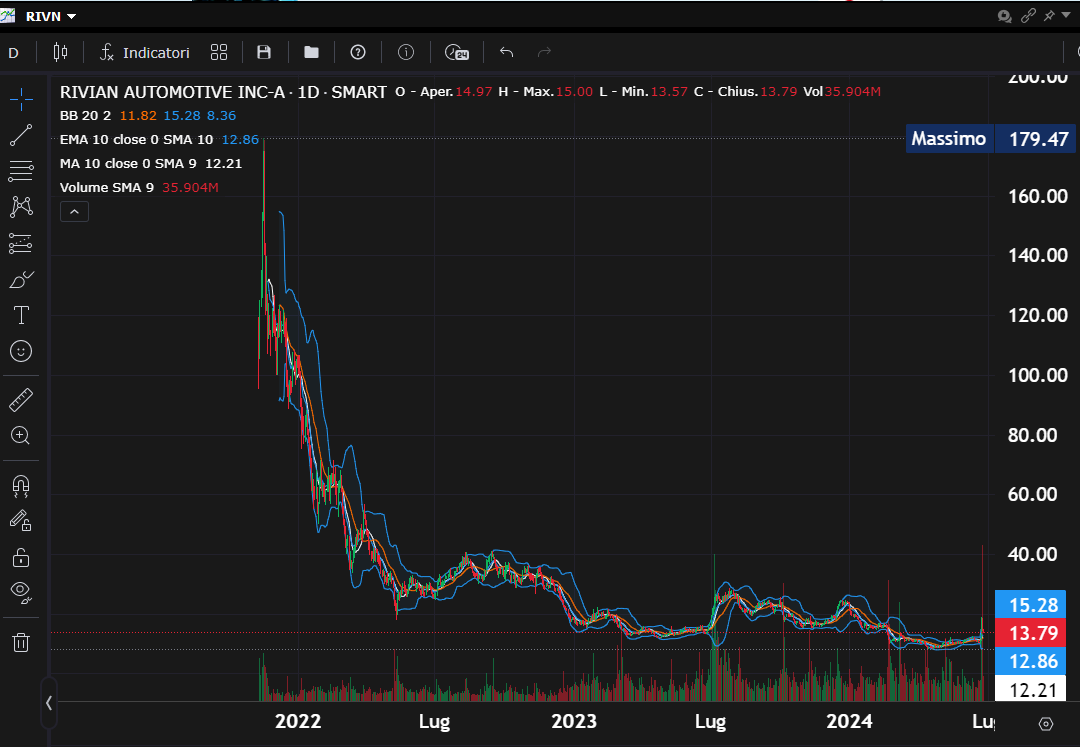 Nel corso del 2024 quindi, Rivian è arrivata a toccare 8.26$ come fondale della discesa iniziata nel 2021, in quella che è una dinamica seguita da molti altri titoli quotati al Nasdaq, i quali, come Rivian, erano stati capaci di suscitare grande euforia alla loro quotazione.