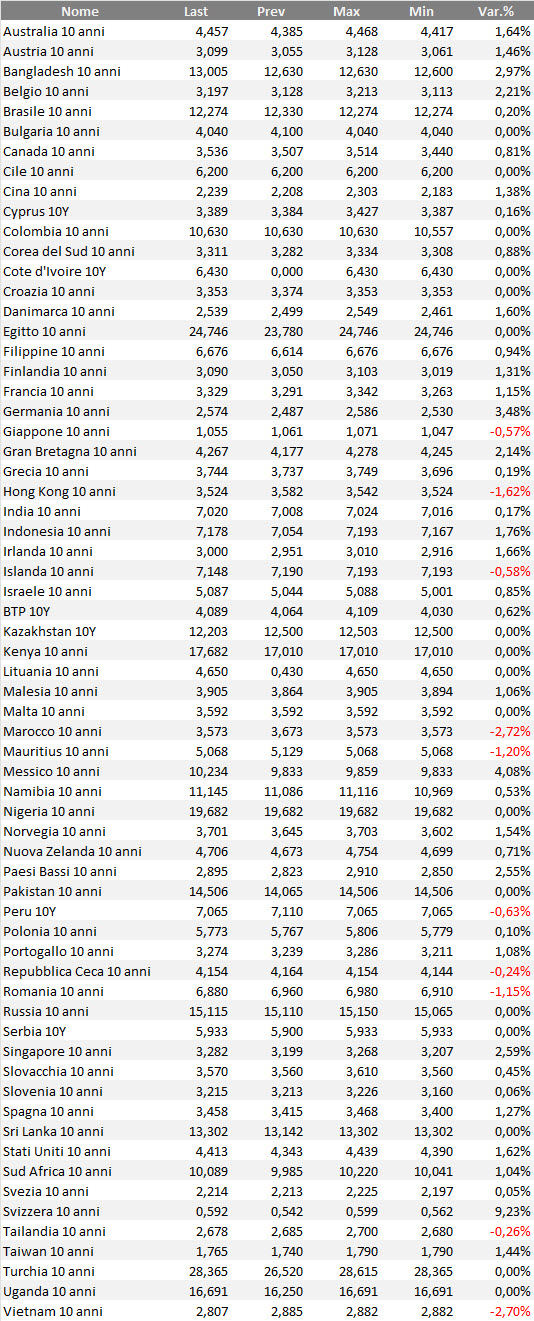 Tabella dei rendimenti, su base settimanale, delle obbligazioni governative mondiali con qualunque rating.