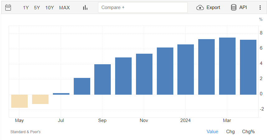 L’S&P/Case-Shiller Home Price Index rilasciato da Standard & Poor’s, che valuta le variazioni nel valore del mercato immobiliare residenziale in 20 regioni degli USA, a livello annualizzato ad aprile segna una crescita del 7,2% rispetto ad una crescita di marzo del 7,5% (rivista da +7,4%). A livello mensile ad aprile, invece, la crescita è del 1,4%, in rallentamento rispetto al +1,6% di marzo.