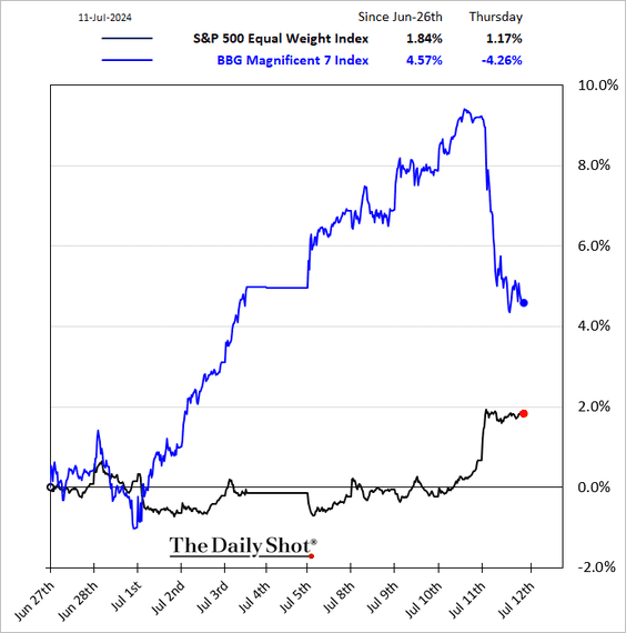 Se notate la linea blu ( i magnifici 7 ) ha perso forza relativa rispetto all'SP 500 Equal Weight Index ( linea nera) e questo testimonia un ribilanciamento sano a favore di un maggior respiro del mercato