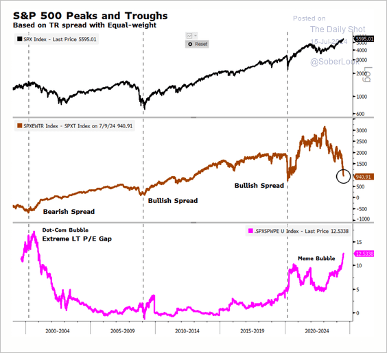 Lo spread tra Sp500 (indice linea nera) e SP500 Equal Weighted (indice linea marrone) è ai massimi storici. In particolare il recente capitombolo dell'SP500 Equal Weighted ( indice linea marrone) forse segnala un apprezzamento relativo eccessivo delle maggiori big cap tra cui ovviamente i magnifici 7.