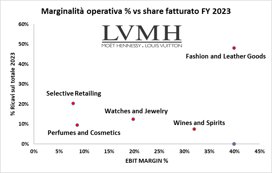 Nel grafico si sono messe in relazione le verie divisioni di LVMH con la loro marginalità operativa: le attività a maggior valore aggiunto sono il Fashion and Leather Goods ed il Wine and Spirits mentre il Perfumes and Cosmetics ed il Selective Retailing presentano un profilo di marginalità decisamente più contenuto.