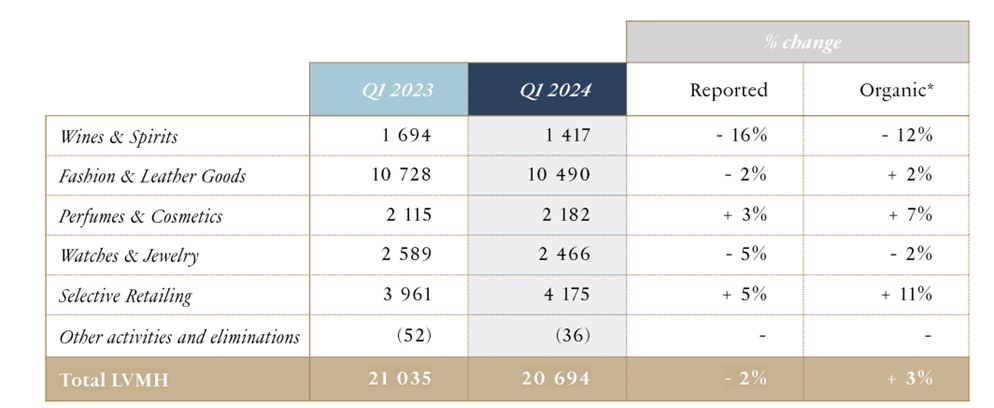 Nel primo trimestre del 2024, LVMH ha riportato una contrazione dei ricavi del 2% rispetto allo stesso periodo del 2023, attestandosi a € 20,7 mld di euro. Questo rallentamento è stato attribuito a diversi fattori. La Cina presenta una ripresa economica più lenta del previsto che ha influito negativamente sulle vendite, nonostante la domanda interna sia rimasta solida. L'Europa e Stati Uniti hanno mostrato una crescita stagnante, con i consumatori che iniziano a ridurre le spese discrezionali a causa dell'incertezza economica.