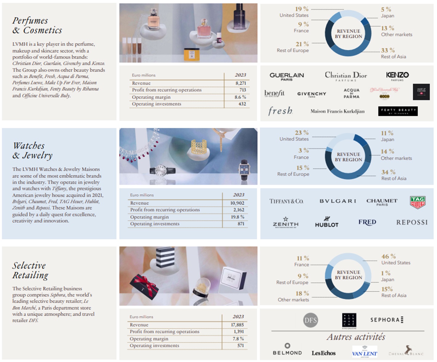Dal punto di vista settoriale, i ricavi del gruppo LVMH sono prevalentemente realizzati all'interno del segmento Fashion and Leather Goods (51%). A seguire ci sono il Selective Retailing (19%), Watches and Jewelry (12%), Perfumes and Cosmetics (10%) e Wine and Spirtis (8%).
