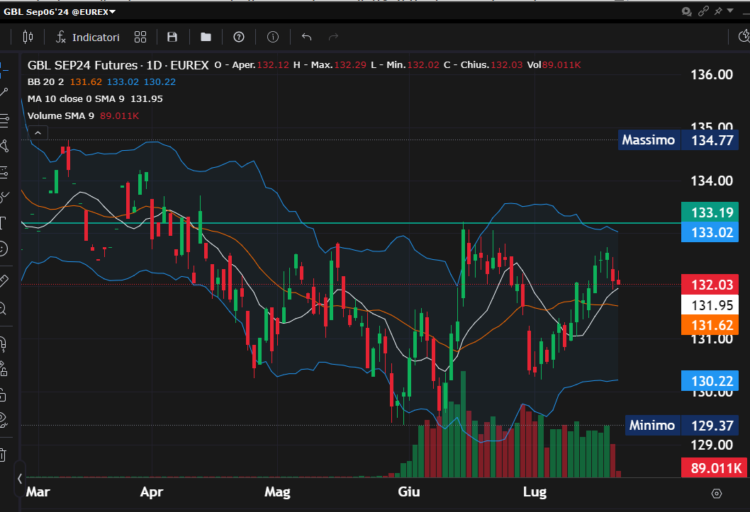 La novità tecnica partita già della scorsa settimana e accentuata dopo la riunine della Bce, la quale ricordiamo, ha lasciato invariati i tassi, la fornisce il mercato obbligazionario con il Bund che sta inscenando un movimento che ancora non dipana le nubi di uno scenario in trading range ma, sappiamo che sopra i 133 punti circa, la ripresa dei prezzi e il calo dei rendimenti hanno una grande opportunità.