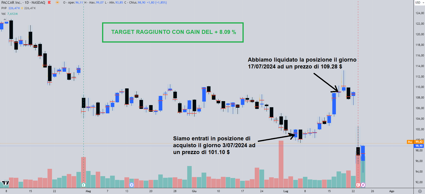 Abbiamo acquisto il titolo statunitense precisamente il giorno 3 luglio 2024, al prezzo di 101,10 $ con la strategia ‘Nasdaq Weekly’ del Portafoglio Storico. Dopo appena due settimane di contrattazioni e precisamente il giorno 17 luglio 2024, il titolo è riuscito a toccare il nostro livello di target a 109,28 $ al quale abbiamo venduto guadagnando un ottimo + 8,09% !