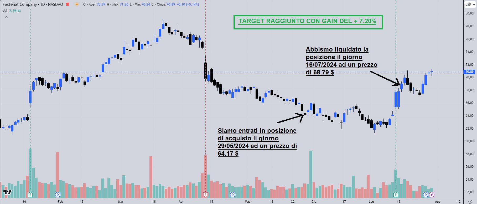 Abbiamo acquistato il titolo statunitense precisamente il giorno 29 maggio 2024, al prezzo di 64,17 $ con la strategia ‘Nasdaq Weekly’ del Portafoglio Storico. Dopo un mese e mezzo di contrattazioni e precisamente il giorno 16 luglio 2024, il titolo è riuscito a toccare il nostro livello di target a 68,79 $ al quale abbiamo venduto guadagnando un buon + 7,20% !