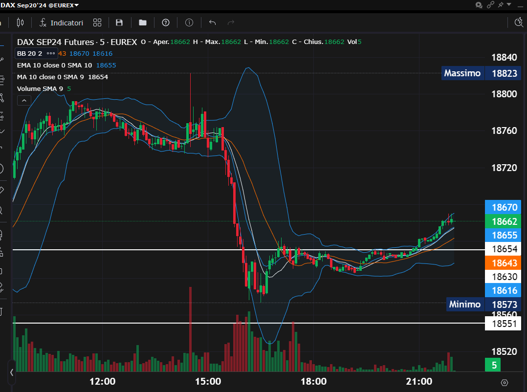 L'ultima giornata, quella del venerdì, ha presentato maggiori sorprese: si è assistito infatti ad una particolare dinamica con una partenza sprint nelle prime ore della mattinata e tale movimento si è verificato sia sull'indice Dax che sul nostro FTSE MIB. Poi successivamente, quando c'è stata l'apertura dei mercati statunitensi, sebbene gli stessi non abbiano avuto una caduta similare, gli indici europei hanno effettuato uno storno in maniera violenta dai livelli massimali raggiunti in mattinata portandoli a chiudere, per quanto riguarda il Dax circa 200 punti sotto i massimi toccati in mattinata.