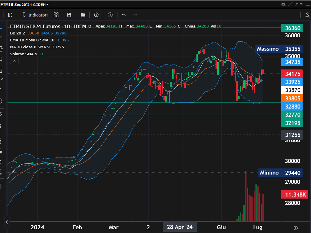 Nel webinar che abbiamo tenuto giovedì 4 luglio di cui vi allego il link ( https://youtu.be/wjOvSfl5lC4?si=hz20zM9CckmfERja ) abbiamo discusso della situazione attuale dei mercati finanziari, contemplando vari aspetti, passando dal mercato obbligazionario statunitense saltando poi a quello europeo tramite i loro due futures dedicati, il Bund ed il T-Bond e successivamente siamo passati all'analisi degli indici azionari maggiori e, abbiamo verificato come vi siano ancora dei possibili step rialzisti che il mercato può andare a cercare di raggiungere. Ulteriori target rialzisti quindi, sono emersi in previsione analitica, osservando e tenendo monitorati dei livelli, facendo riferimento alll'algebra booleana if/or/not e quindi se tali punti tenderanno a resistere ad urti ribassisti, la tenuta può favorire un ulteriore allungo rialzista con target posti ancora più in alto.