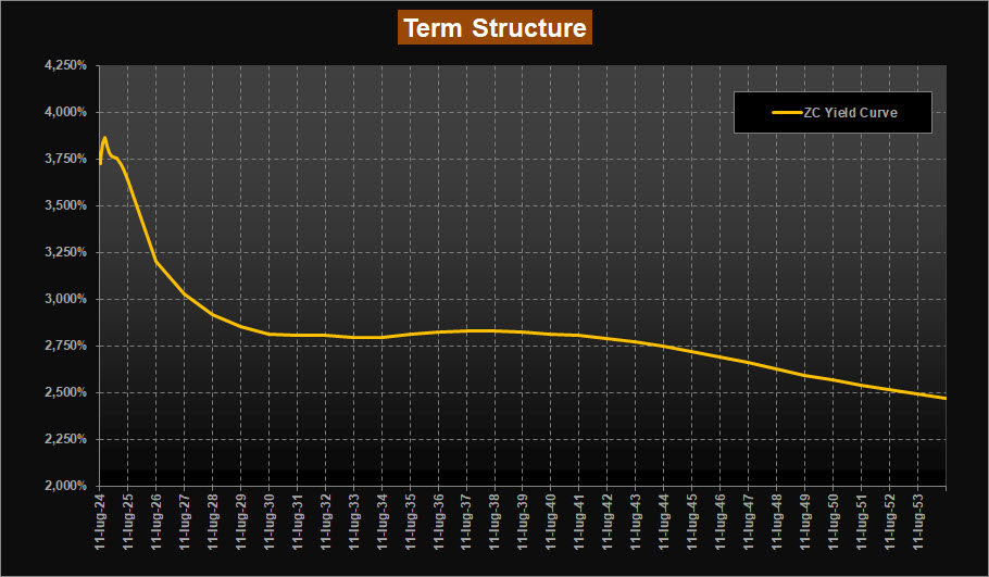 Stabile il tratto a breve, con la curva che esprime sempre un massimo di rendimento sulle scadenze corte per fine 2024 tra area 3,75% e 3,80%.