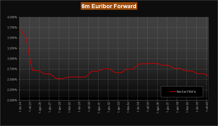 Stabili le previsioni fornite dai tassi forward su Euribor 6 mesi sulle scadenze a breve, con tassi attesi sempre poco sotto area 3,75% per inizio 2025. Si conferma anche la discesa quasi verticale sulla parte a breve, con la curva che scende repentinamente per assestarsi nell’intervallo di area 2,60% - 2,50% per le scadenze 2028-2031. Confermate anche le previsioni di risalita dei tassi al 2032 con un picco sotto area 3,00% dal 2034 al 2037.