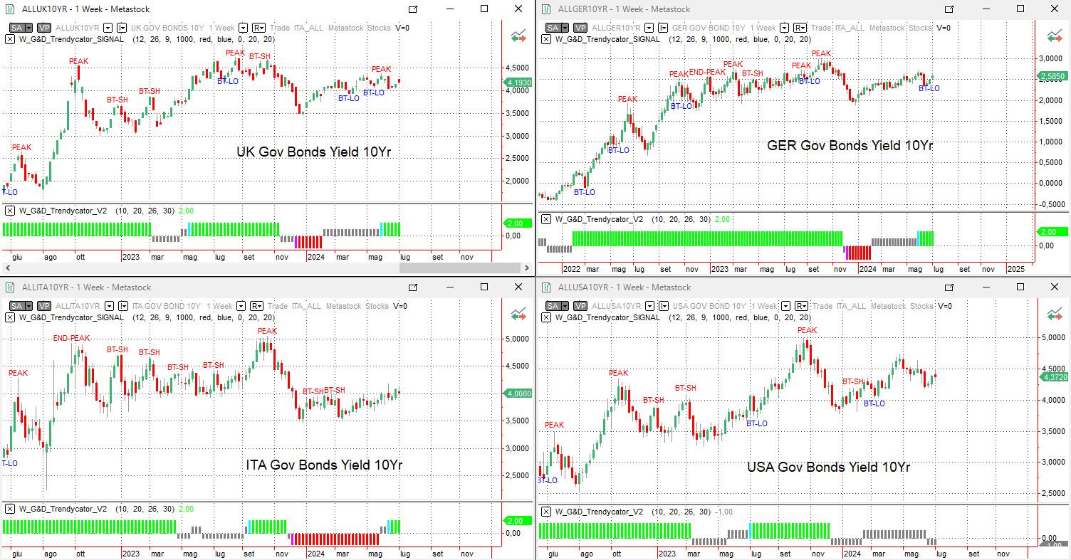 Analizzando con il Trendycator le curve dei rendimenti su scala settimanale dei principali benchmark decennali non si notano sostanziali variazioni al quadro di riferimento come tracciato nelle scorse analisi.