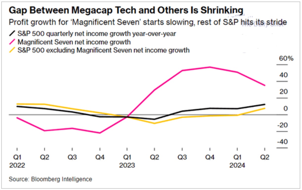 Dai 2 grafici che seguono sembra proprio di sì: nel primo si vede come i profitti dei Magnifici 7 siano in calo (linea lilla) mentre quelli dell'SP500 (linea nera) e dell'SP500 escluso i Magnifici 7 (linea gialla) siano in fase di espansione, moderata, ma di espansione