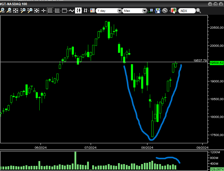 La foto del Nasdaq 100 evidenzia la formazione perfetta, e mostra anche i volumi in contrazione.