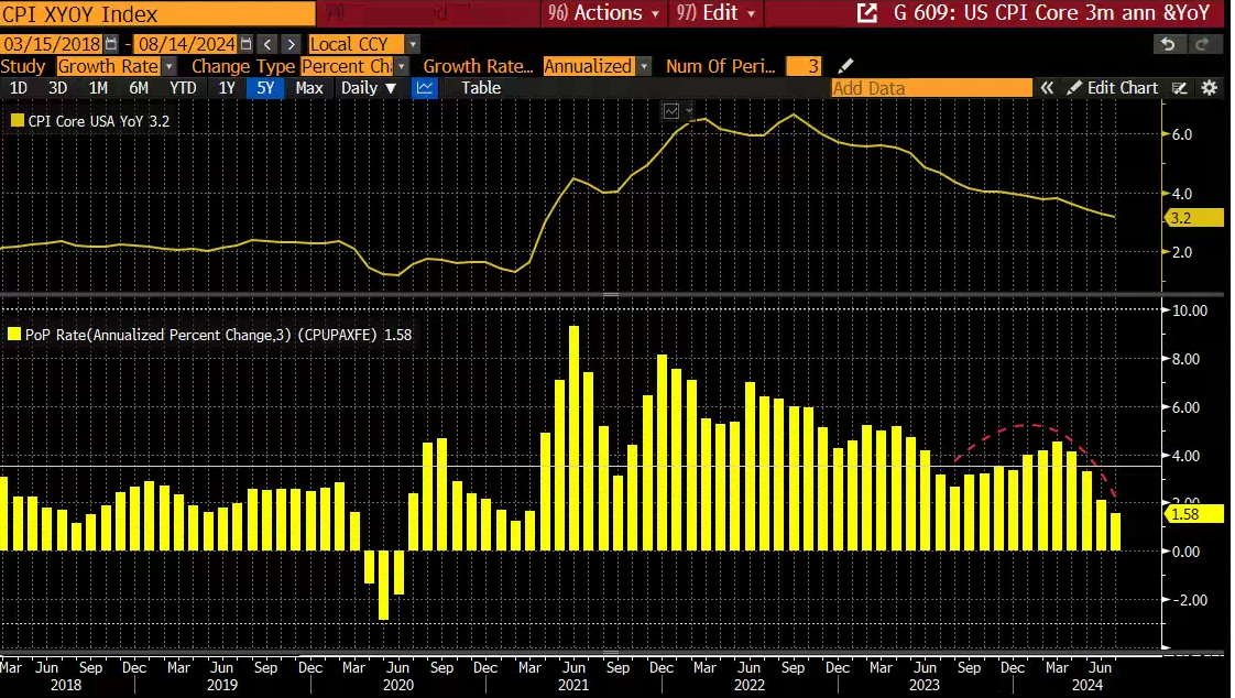 Bene anche il Russell 2.000, + 1.61%, e sugli scudi le Magnificent 7 (+3.11%) trainate da Nvidia (+6.5%) che ha trascinato anche il Philadelphia Semiconductor (+4.18%). Il fatto che i rendimenti siano calati in maniera robusta (10 anni treasury -6 bp a 3.84%) ci indica quale sia stato il catalyst: un PPI USA di luglio benigno, un CPI sempre di luglio abbastanza in linea con le attese con i dati annualizzati (headline e core) in discesa dello 0,1% rispetto alla rilevazione precedente e vendite al dettaglio che hanno sorpreso in positivo rispetto ale mese precedente e alle attese degli analisti, che hanno contribuito a dissipare le preoccupazioni per un rallentamento economico innescato da dati sull'occupazione più deboli del previsto all'inizio del mese: (v. grafico):