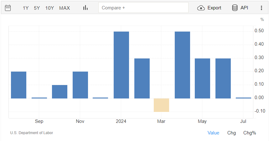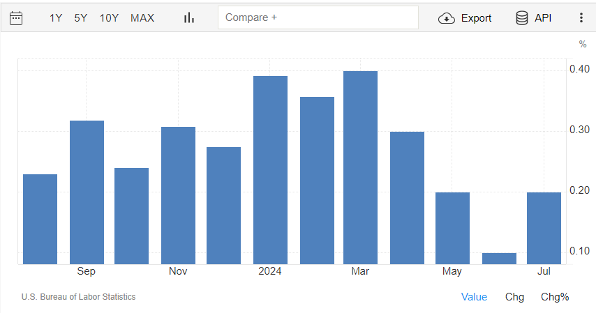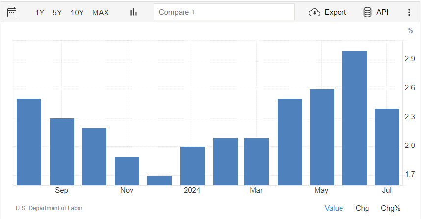 Su base annua, invece, il dato a luglio si attesta al 2,4%, sotto al consensus del 2,7% ed in calo rispetto al 3,0% di giugno. I dati sono rilasciati dall’U.S. Bureau of Labor Statistics.