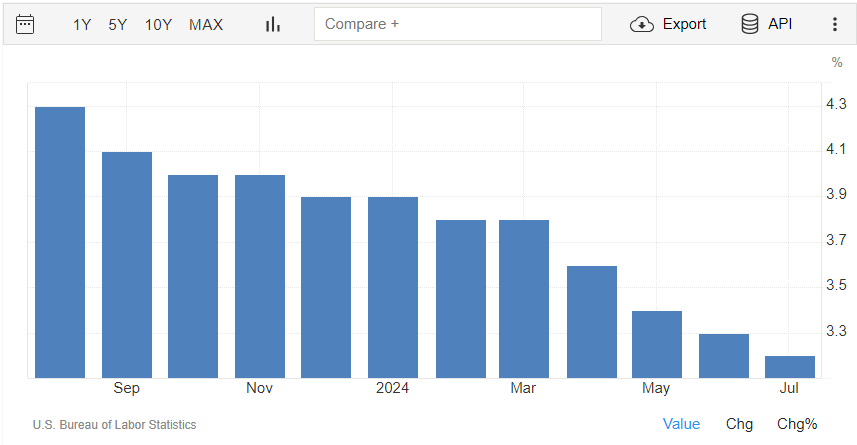 Su base annua, il dato di luglio si attesta al 3,2%, stesso livello indicato dal consensus ed appena sotto al 3,3% di giugno. I dati sono rilasciati dall’U.S. Bureau of Labor Statistics.