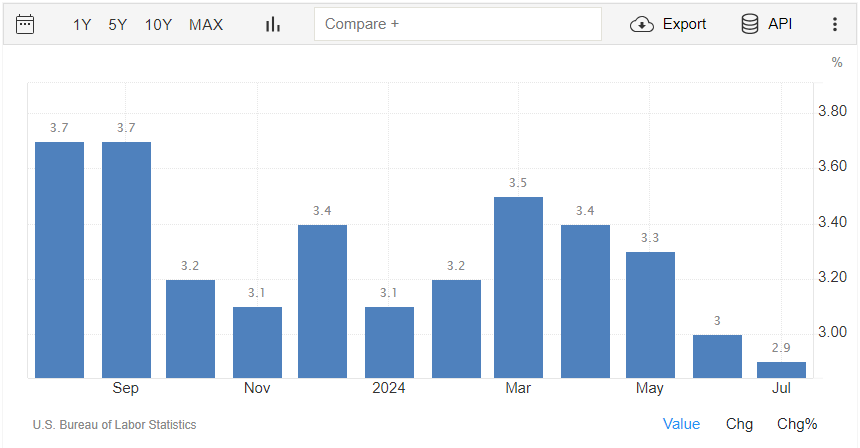 L’indice dei prezzi al consumo su base annua a luglio è al 2,9%, appena sotto al consensus del 3,0% ed alla rilevazione di giugno del 3,0%. Si tratta del quarto mese consecutivo con un rallentamento. Il dato è rilasciato dall’U.S. Bureau of Labor Statistics.