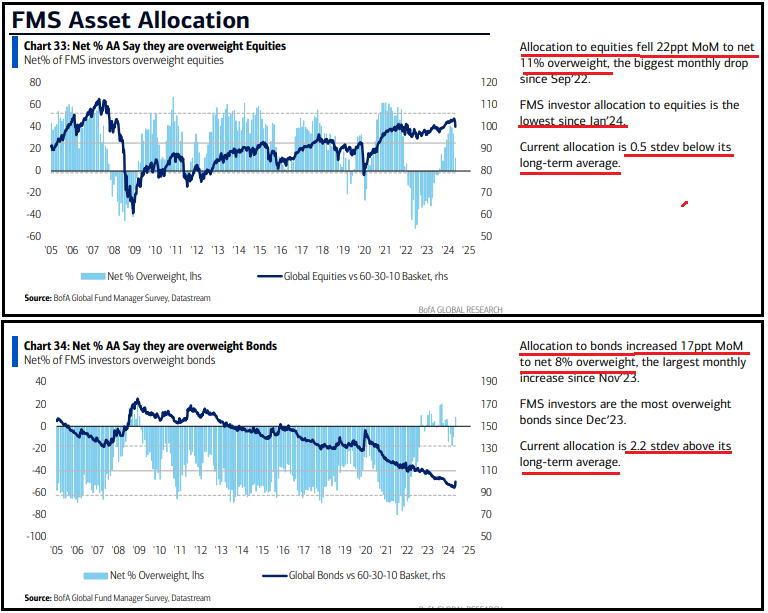 Parlando di posizionamento, la Fund manager Surver di agosto di Bank of America manda un segnale simile, con l'esposizione all'azionario calata ai minimi da inizio anno e i Bonds in sovrappeso per la prima volta da marzo (v. grafico):