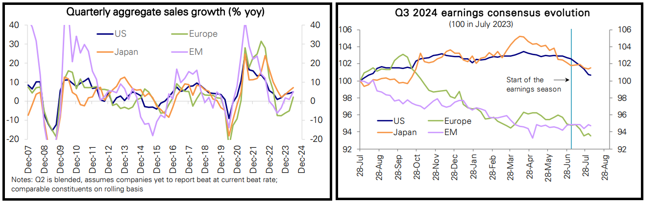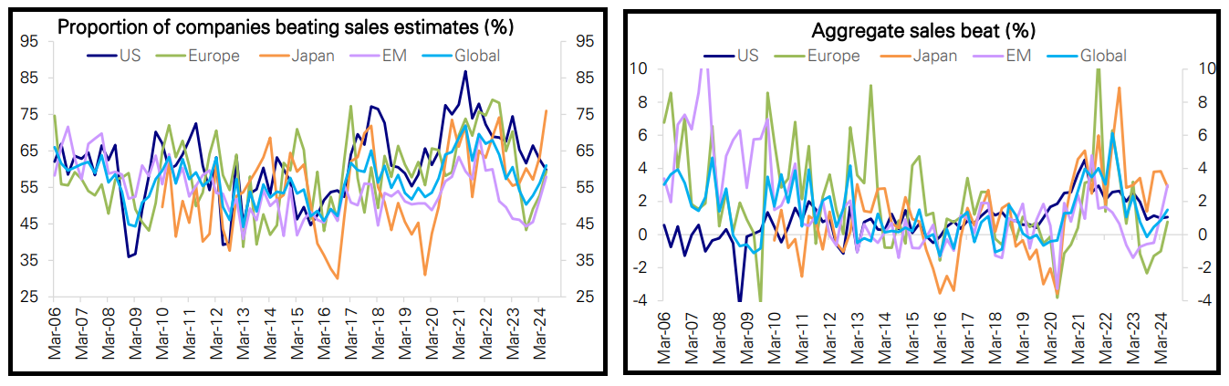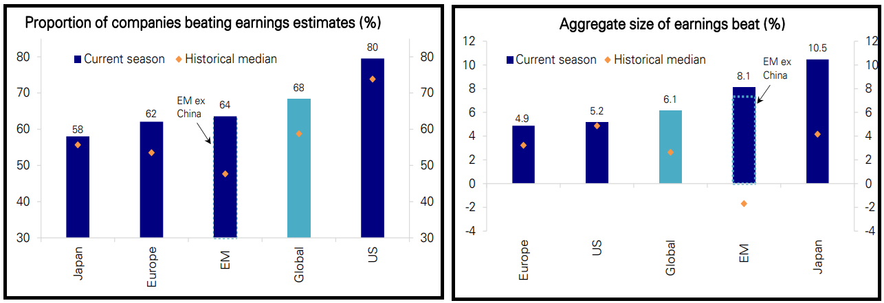 1) La percentuale di aziende che ha battuto le stime è stata superiore alla media in tutte le aree geografiche. La sorpresa media è tornata in linea con la media di lungo periodo in US, dove era stata superiore, ed è stata invece superiore alla media in tutti gli altri blocchi, in particolare negli emergenti. La Cina non è più stata causa di sottoperformance come negli scorsi trimestri.