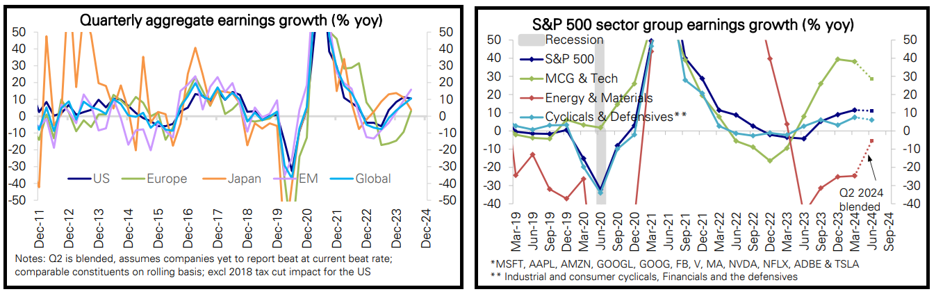 3) La crescita degli utili in aggregato a livello globale ha accelerato (+10%), ma nel dettaglio le accelerazioni sono state negli emerging (oltre il 15%, ai massimi da 8 trimestri) in Europa (tornata alla crescita anno su anno, +2.8%) mentre negli USA la crescita degli utili risulta stabile attorno al 10% e in Giappone è un po' calata, a toccare il livello dell'Europa. Guardando agli USA, la previsione di DB di un mese fa si sta avverando, con la crescita che accelera in energy & materials, resta buona per ciclici e difensivi, e rallenta sul big tech, pur restando su livelli elevati. In altre parole vi è una convergenza tra i titoli dei ‘Magnificent 7’, che avevano un ritmo di crescita insostenibile, e il resto.