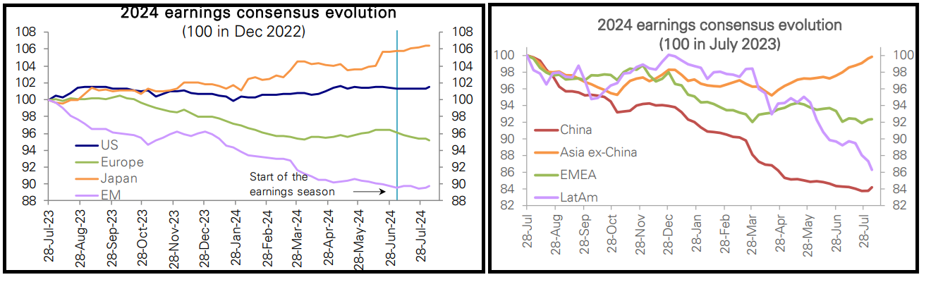 6) In termini di consenso per l'intero 2024, quello per Wall Street è rimasto costantemente stabile negli ultimi 12 mesi, mentre sul Giappone è salito, ed Europa ed Emergenti hanno visto costante ridimensionamento, questi ultimi principalmente a causa della Cina, il cui consenso non ha fatto altro che calare, e più recentemente del Latam.