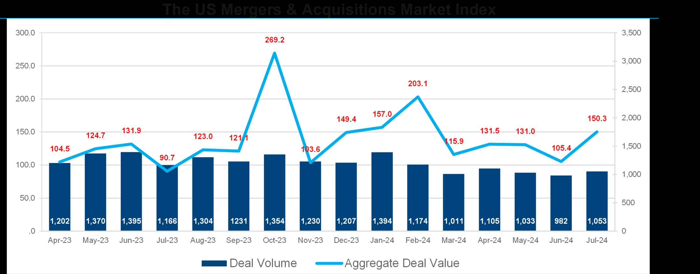 L'attività di fusioni & acquisizioni (M&A) negli Stati Uniti è aumentata a luglio, salendo del 7,2% con 1.053 annunci rispetto ai 982 di giugno. Anche la spesa M&A aggregata è aumentata. A luglio è stato speso il 42,6% in più per gli accordi rispetto a giugno.