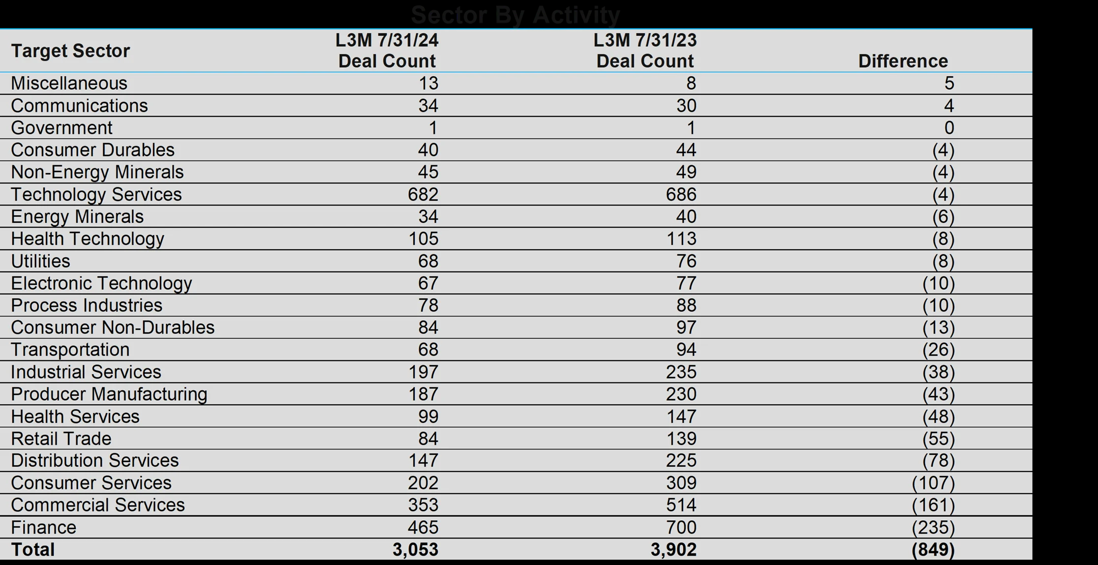 Viceversa, 18 dei 21 settori monitorati da FactSet hanno visto un calo trimestrale nell'attività rispetto allo stesso trimestre dell'anno scorso. I cinque settori che hanno assistito ai maggiori cali nel volume di M&A sono stati: Finanza (465 contro 700), Servizi commerciali (353 contro 514), Servizi al consumatore (202 contro 309), Servizi di distribuzione (147 contro 225) e Commercio al dettaglio (84 contro 139).
