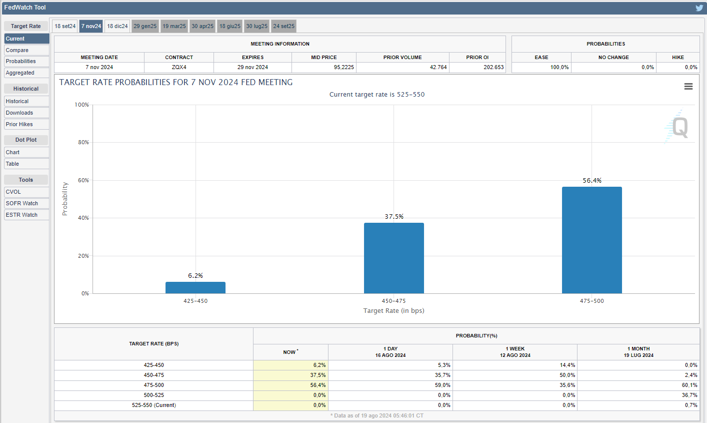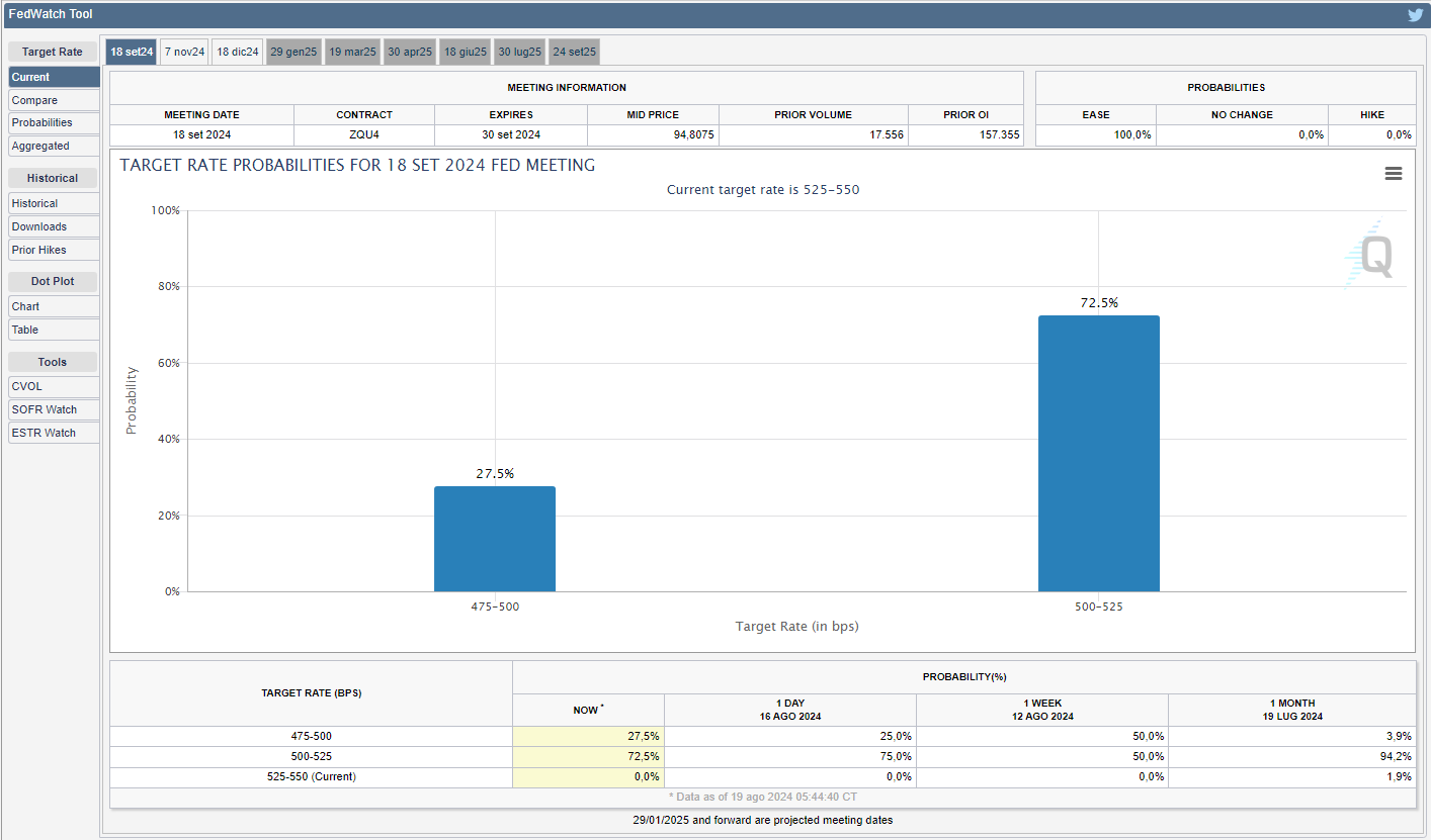 Lo strumento FedWatch del CME Group mostra come le probabilità del primo taglio dei tassi nella riunione del 18 settembre siano tornate in netto aumento per un taglio di 25 bps a scapito di quelle di un taglio di 50 bps con le prime al 73,5% e le seconde al 26,5%. Non sono quotate altre opzioni (v. grafico):