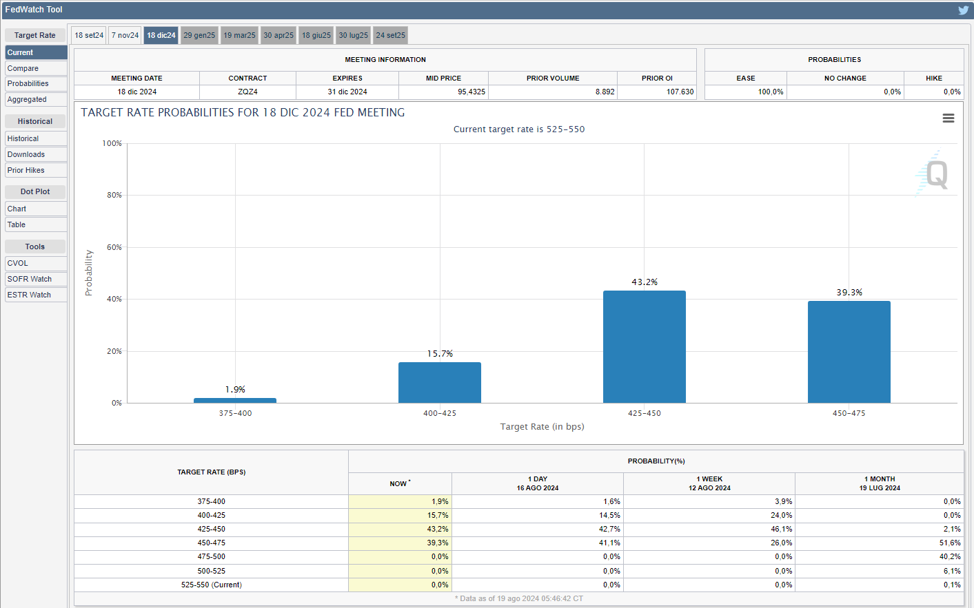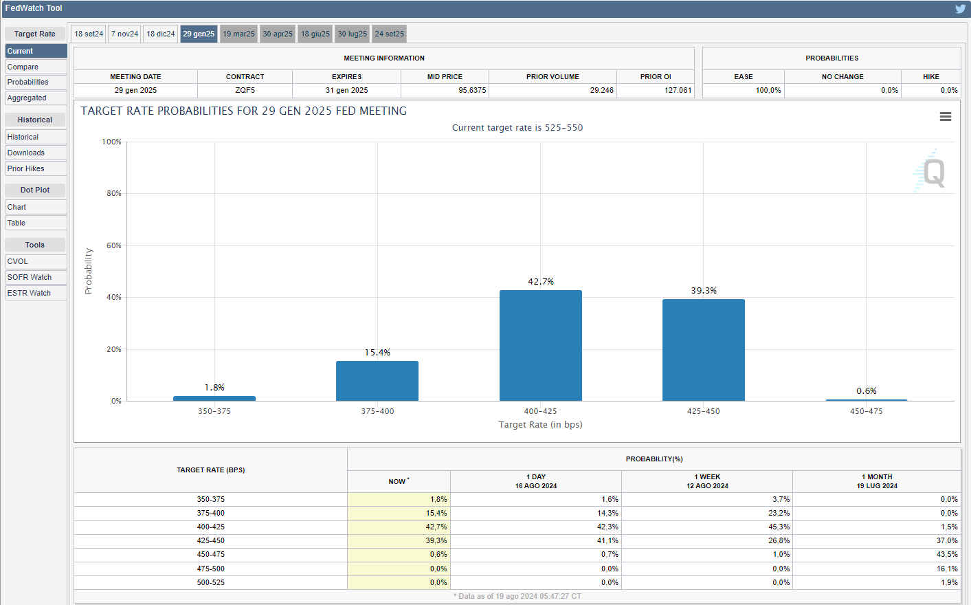 I dati macroeconomici più ottimistici pubblicati giovedì scorso dagli Stati Uniti hanno spinto gli investitori a credere ulteriormente a un taglio dei tassi della FED di 25 bps a settembre rendendo difficile per il metallo giallo raccogliere consensi rialzisti. Il Dipartimento del Lavoro ha riferito che le richieste settimanali di sussidi di disoccupazione iniziali sono diminuite di 7.000 a 227.000 nella settimana conclusasi il 10 agosto, mentre altri dati hanno mostrato che le vendite al dettaglio sono aumentate dell'1% su base mensile a luglio, superando le aspettative del mercato per un aumento dello 0,3%. Dopo queste pubblicazioni, le probabilità di un taglio dei tassi della FED di 50 bps a settembre scendevano ulteriormente.