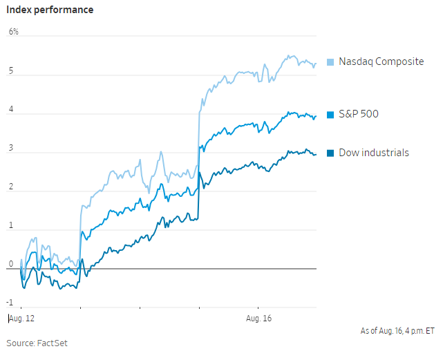 A guidare l'inversione di tendenza sono stati i report della scorsa settimana sulle vendite al dettaglio, inflazione e prezzi alla produzione, che hanno contribuito a dissipare le preoccupazioni per un rallentamento economico innescato da dati sull'occupazione più deboli del previsto all'inizio del mese. I dati economici positivi della scorsa settimana e i prezzi degli alloggi più elevati del previsto a luglio hanno inoltre ridotto le aspettative che la Federal Reserve taglierà i tassi di interesse di 50 punti base nella riunione di settembre, con un taglio di 25 punti base ora ritenuto più probabile.