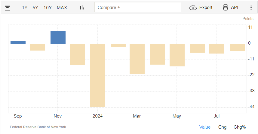 L’indice manifatturiero del New York Empire State ad agosto è pari a -4,70 punti, in crescita rispetto ai -6,60 punti di luglio. Il dato è rilasciato dalla Federal Reserve Bank di New York.