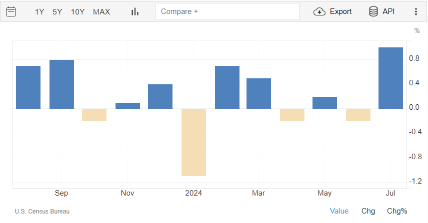 Le vendite al dettaglio a livello mensile a luglio crescono dell’1,0%, oltre il consensus del +0,3%. Nel mese di giugno era stato registrato un calo dello 0,2% (rivisto da +0,0%). Il dato è rilasciato dall’U.S. Census Bureau.