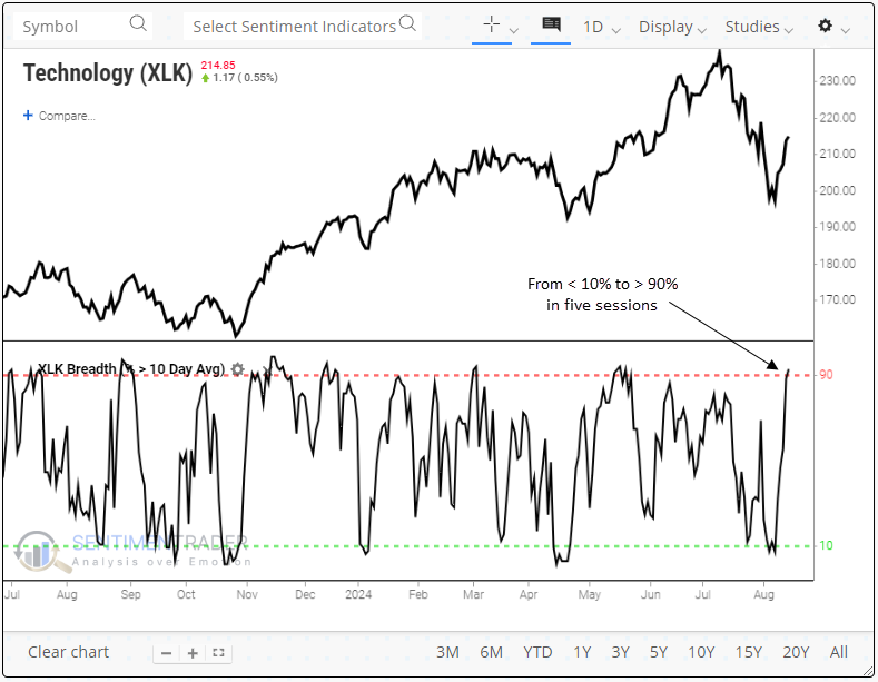 Nelle ultime cinque sessioni, la percentuale dei titoli del settore tecnologico dell’indice S&P 500 al di sopra della media decennale è passata da meno del 10% a oltre il 90%, innescando un segnale di spinta in ampiezza.