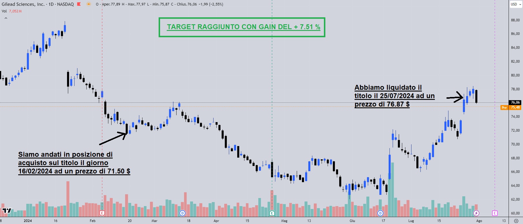 Abbiamo acquisto il titolo statunitense precisamente il giorno 16 febbraio 2024, al prezzo di 71,50 $ con la strategia ‘Nasdaq Weekly’ del Portafoglio Storico. Dopo aver rischiato a maggio con le quotazioni che si erano avvicinate al nostro livello di STOP, a metà giugno il titolo ha iniziato una cavalcata impressionante recuperando tutta la perdita fittizia, riuscendo ad andare a target a 76,87 $ il 25 luglio 2024, giorno nel quale abbiamo venduto guadagnando un buon + 7,51% !