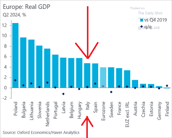 Il primo mostra la variazione del PIL trimestre su trimestre tra l'ultimo disponibile oggi e l'inizio del COVID. Come potete vedere ci posizioniamo dietro Paesi che magari pensiamo improponibili come Polonia, Bulgaria e Lituania (su quest'ultimo io ho una ottima opinione avendolo visitato diverse volte ed avendo diversi amici).