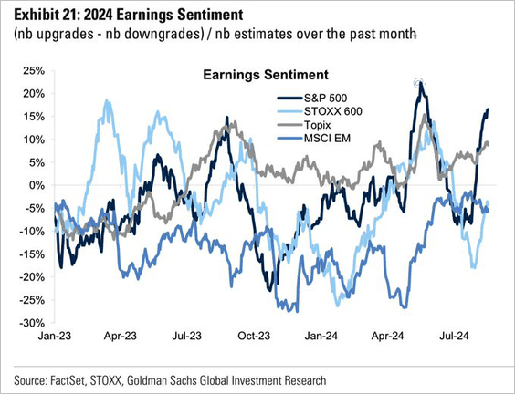 Non è una novità ma le azioni USA continuano a sovraperformare quelle del resto del mondo. Nel grafico che segue mostriamo il sentiment sugli earning dato dalla differenza tra il numero di upgrades e il numero di downgrades diviso il totale delle stime nel mese precedente.