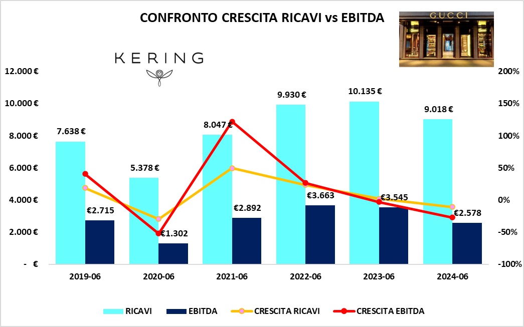 Analizzando i ricavi semestrali di KERING dal primo semestre del 2018 al primo semestre del 2024, si osserva una crescita significativa, con alcune fluttuazioni dovute a contesti macroeconomici e specifici del settore.