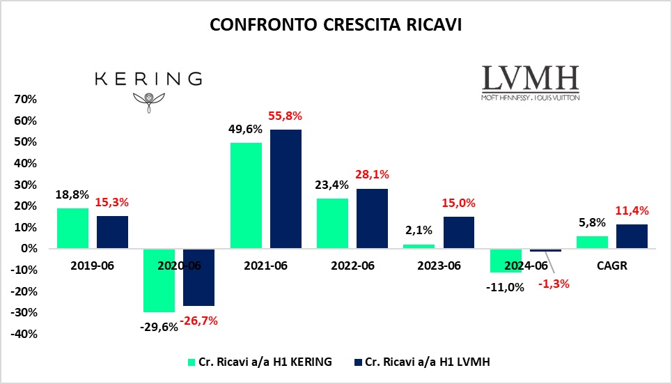 Nell'immagine che segue si nota quale sia il confronto tra la crescita di breve termine rispetto al CAGR 2020-24: Gucci, ad esempio, a fronte di una crescita media del 7,38%, nel H1 ha perso più del 20%.