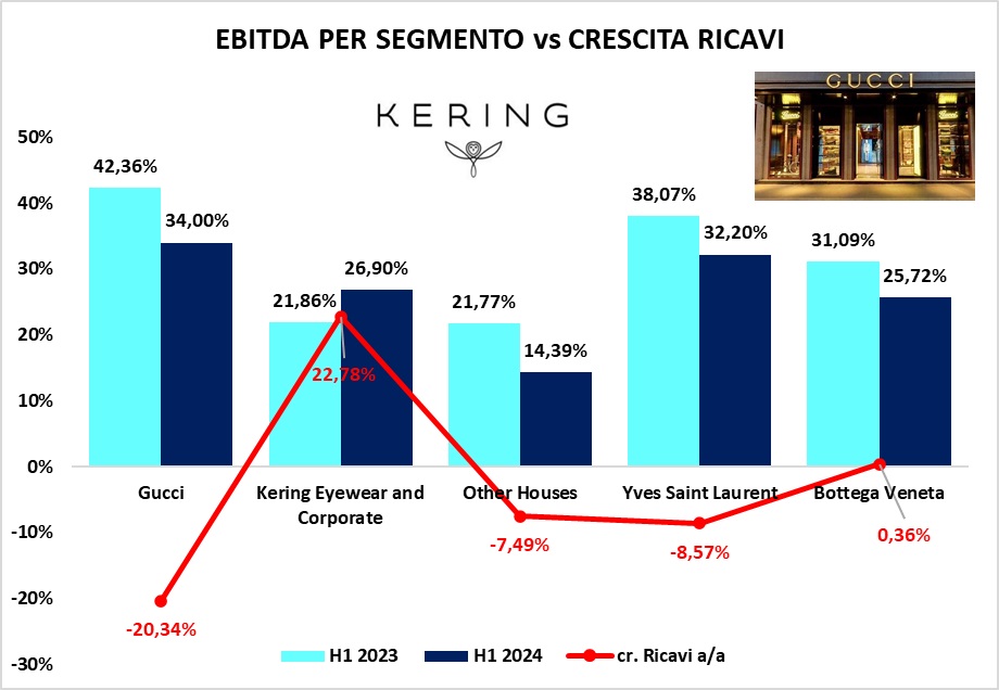 Approfondendo l'analisi per i diversi segmenti di business si nota una complessiva diminuzione della marginalità. Escludendo il caso di KERING Eyewear and Corporate, tutti gli altri settori evidenziano una fase piuttosto complicata.