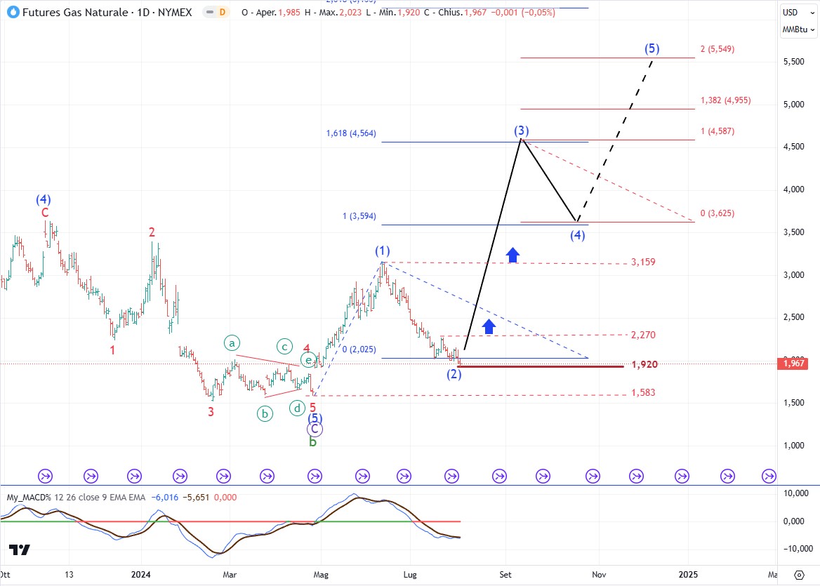 Il Gas Naturale, dovrebbe essere vicino alla fine di un ritiro in contro trend durato oltre 2 anni. I presupposti per la conferma di questo assunto sono la tenuta del minimo di 1,482 e il superamento di quota 2,270 darebbe una ragionevole certezza che l’onda (3) è in corso. La conferma definitiva al superamento del massimo di onda (1) a 3,159. A questo punto entreremo long al superamento in chiusura di 2,27 e posizioneremo lo stoploss iniziale sotto al minimo di onda (2) a 1,92 se il minimo resterà quello. Se scenderà più in basso prenderemo il nuovo minimo.