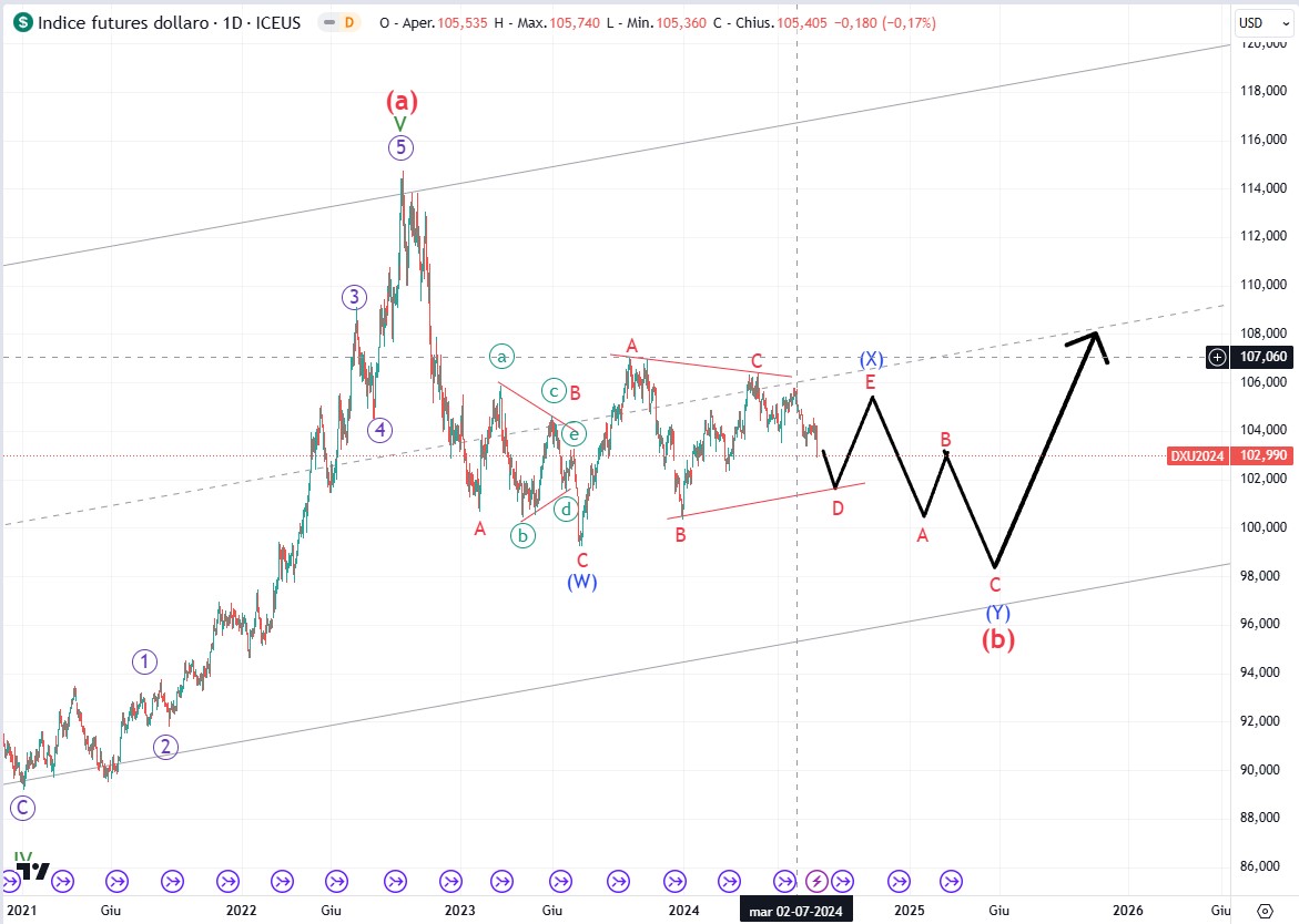 Il dollar index continua a suddividere l’onda D del triangolo che ormai ha fatto buoni progressi ed è ormai alle battute finali. I prezzi sono scesi al minimo intraday di 103.125. Dopo il calo del dollaro USA da 106.517, il massimo dell'onda C del 16 aprile è ancora un po' corto per l'onda D, ma l'onda ora è più accettabile di quanto lo fosse a luglio. Una volta completata l’onda D, il dollaro USA si muoverà nell’onda E del triangolo, un parziale ritracciamento al rialzo del declino iniziato al massimo del 16 aprile.