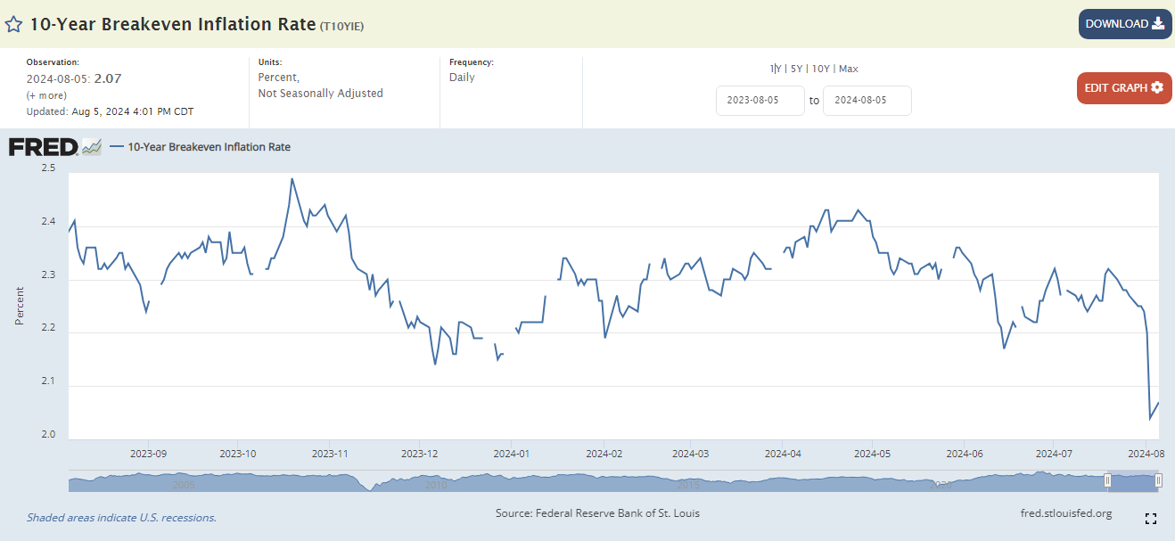 Crollano ovviamente anche i tassi reali, al netto dell’attuale tasso di inflazione, che si avvicinano sempre più al target che la FED si prefigge di raggiungere. Come mostrato dal grafico del breakeven inflation a 10 anni, in chiusura di ieri il tasso si porta alle quotazioni del gennaio 2021 scendendo al 2,07% dal 2,25% di due lunedì fa (v. grafico):