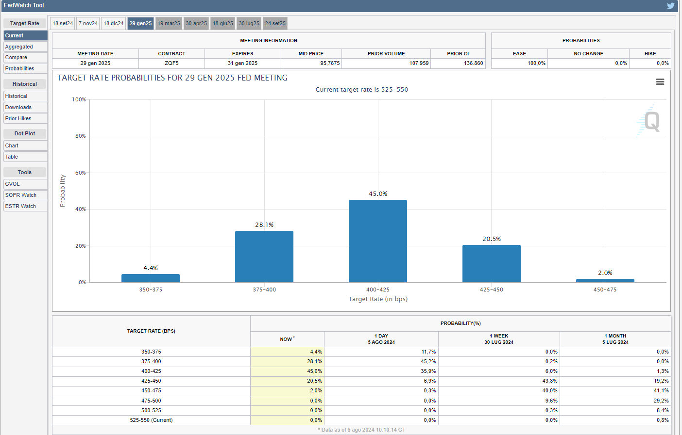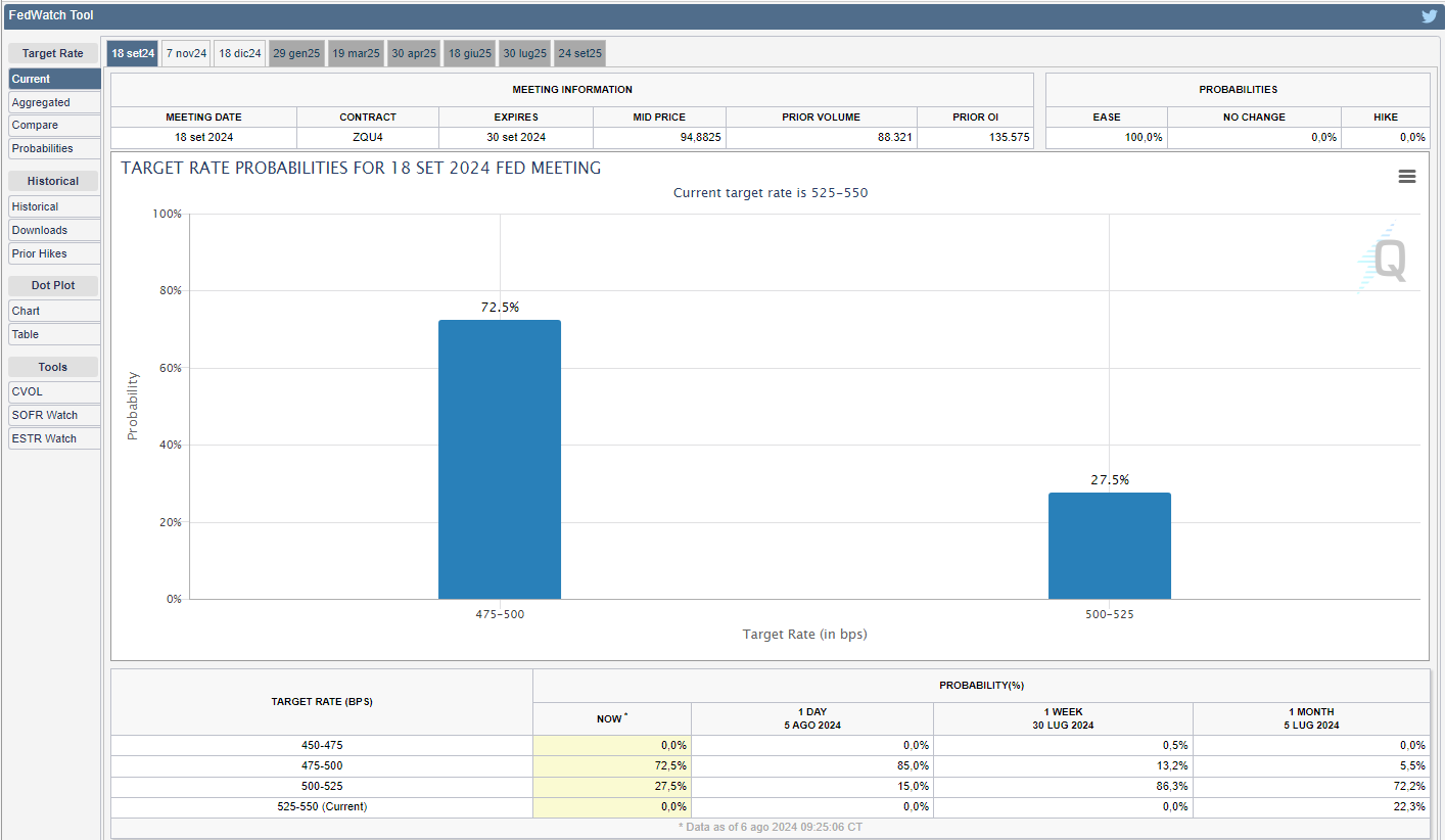 Lo strumento FedWatch del CME Group mostra come le probabilità del primo taglio dei tassi nella riunione del 18 settembre si siano alzate notevolmente e soprattutto per un taglio di 50 bps con una percentuale del 72,5. Ovviamente sono scese le probabilità di un taglio pari a 25 bps sono ora al 27,5% rispetto al 90,0% di due venerdì fa. Praticamente quasi inesistenti le probabilità per nessun taglio o di un taglio per complessivi 50 bps (v. grafico):